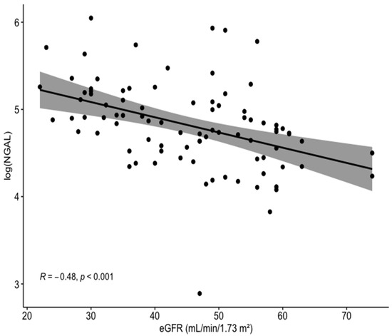 Correlation between the log of baseline serum NGAL levels and eGFR for the entire cohort. NGAL, neutrophil gelatinase-associated lipocalin; eGFR, estimated glomerular filtration rate.