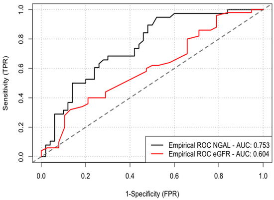 According to the ROC curve, baseline NGAL levels performed better than eGFR to predict CI-AKI (AUC 0.753 vs. 0.604) with the optimal cutoff value for baseline NGAL to predict CI-AKI being 127 ng/mL (sensitivity of 68% and specificity of 68%, p < 0.001) (Figure 2).