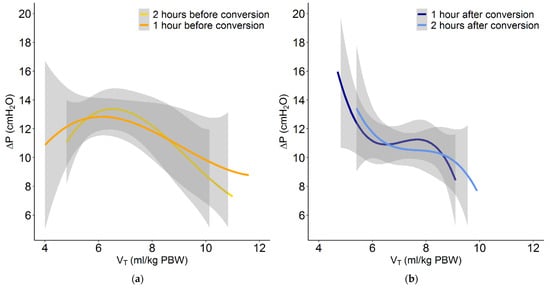 Plot of the relation between VT and ΔP with conventional ventilation at (a) 2 and 1 h before conversion to INTELLiVENT-ASV, and at (b) 1 and 2 h after conversion.