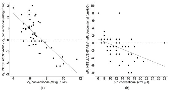Scatterplot of individual changes in (a) tidal volume (ml/kg PBW) and (b) driving pressure (cm H2O) when the patients were switched from conventional ventilation, at 1 h before conversion, to INTELLiVENT-ASV (VT, INTELLiVENT-ASV-VT, INTELLiVENT-ASV; and ΔP, INTELLiVENT-ASV-ΔP, conventional) 2 h after conversion. Continuous line; regression lines. Each patient was characterized by a single data point. A negative value for VT or ΔP means that the conversion to INTELLiVENT-ASV resulted in a lower VT or ΔP, and a positive value means that VT or ΔP increased after the conversion.