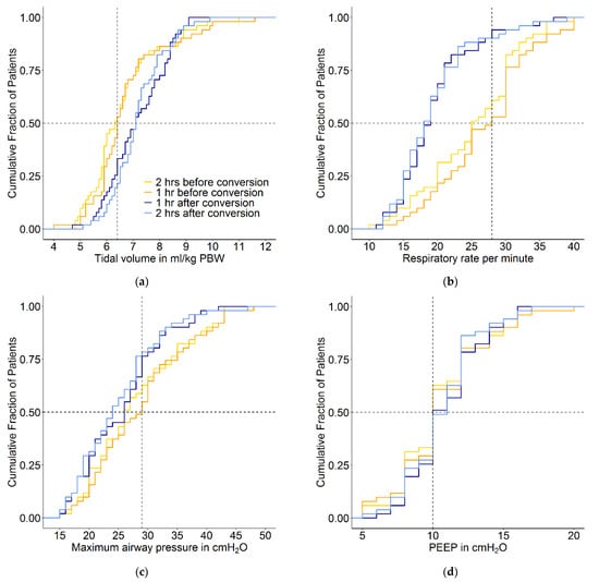 Cumulative frequency distribution of (a) tidal volume, (b) respiratory rate, (c) maximum airway pressure, (d) PEEP, (e) etCO2 and (f) SpO2. The plots show the ventilation variables 2 and 1 h before the conversion and 1 and 2 h after the conversion from conventional ventilation to INTELLiVENT-ASV. Vertical dotted lines represent the median at the last hour before the conversion, and horizontal dotted lines show the respective proportion of patients reaching each cutoff.