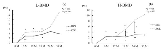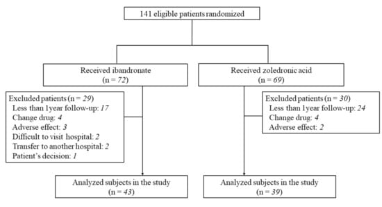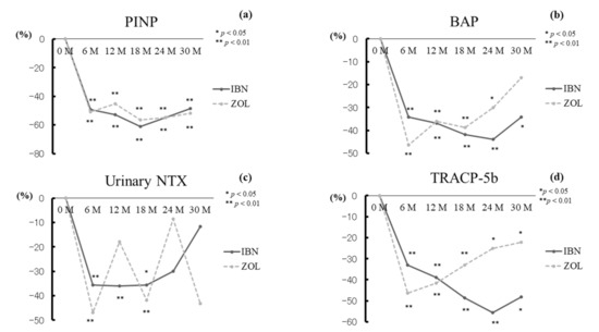 APA StyleUehara, M., Nakamura, Y., Suzuki, T., Nakano, M., & Takahashi, J. (2021). Efficacy and Safety of Oral Ibandronate versus Intravenous Zoledronic Acid on Bone Metabolism and Bone Mineral Density in Postmenopausal Japanese Women with Osteoporosis. Journal of Clinical Medicine, 10(22), 5420. https://doi.org/10.3390/jcm10225420