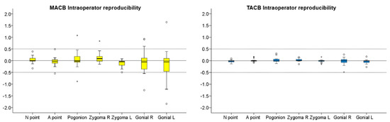 Box plots showing the intra-operator reproducibility of the MACB (Middle Anterior Cranial Base) and the TACB superimpositions (Total Anterior Cranial Base) for the detected T0–T1 changes in mm, for all measurement areas. The zero value, depicted by the continuous horizontal line, indicates perfect reproducibility, whereas any deviation from zero is considered an error. The dashed lines indicate 0.5 mm and −0.5 mm. In the boxes, the upper limit of the black line represents the maximum value, the lower limit the minimum value, the box the interquartile range, and the horizontal black line the median value. Outliers are shown as black dots or stars in more extreme cases.