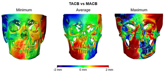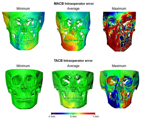 Figure 2 shows the MACB and TACB intra-operator reproducibility through the color-coded distance maps of three cases for each method, representative of the minimum, the average, and the maximum error. It is evident that after MACB superimposition, the average error exceeded 1 mm in certain areas.