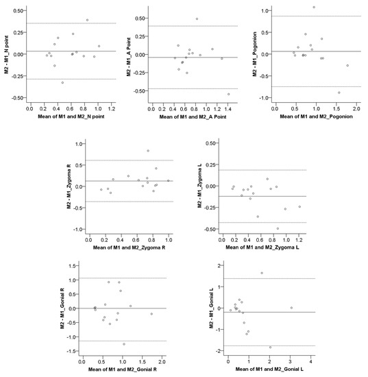 Bland–Altman plots of the T0–T1 changes (mm) detected through repeated MACB superimpositions by the same operator. The continuous horizontal line shows the mean of the differences in the detected T0–T1 changes, and the dashed lines show the corresponding 95% Limits of Agreement. M1: Measurement 1; M2: Measurement 2.