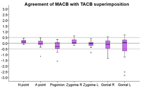 Box plots showing the agreement of the MACB (Middle Anterior Cranial Base) with the TACB (Total Anterior Cranial Base) superimposition for the detected T0–T1 changes in mm, for all measurement areas. The zero value, depicted by the continuous horizontal line, indicates perfect agreement, whereas any deviation from zero is considered a disagreement. The dashed lines indicate 0.5 mm and −0.5 mm. In the boxes, the upper limit of the black line represents the maximum value, the lower limit the minimum value, the box the interquartile range, and the horizontal black line the median value. Outliers are shown as black dots or stars in more extreme cases.