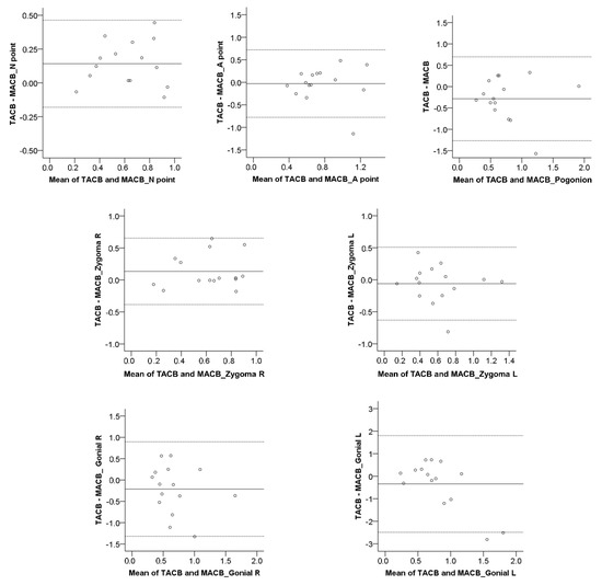 The Bland–Altman method (difference plot) [25] was also used to evaluate intra-operator reproducibility in the detected T0–T1 morphological changes through MACB, as well as the agreement between MACB and TACB superimpositions. Bland–Altman plots regarding the reproducibility of the TACB method have been published previously [18]. A one-sample t-test was used to assess if there was a systematic error between the compared measurements.
