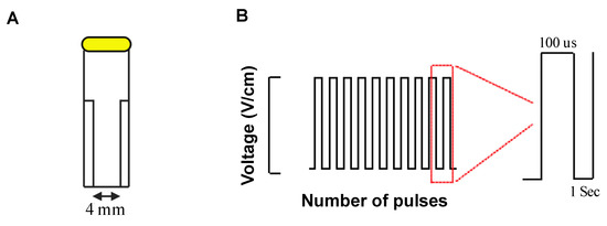 Irreversible electroporation experiment setup. Cell suspensions within a 4 mm gap cuvette placed in an external field (A) of monophasic pulses of different number and voltages in 1 Hz frequency as inter pulse interval and 100 us duration (B).