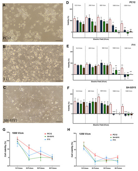Neuronal viability is reduced by increasing electric field strength. The percentage of cell viability was normalised against control cells (no electroporation) in PC12 (A), F11 (B), and SH-S5Y5 (C) cells. (D) In PC12 suspension cells, there was a significant difference at 1000 and 1250 V/cm at 30, 50, and 60 pulses. (E) In F11 suspension cells, the cell viability was significantly reduced at 1000 V/cm of 30, 50, and 60 pulses and at 1250 V/cm at 10, 30, 50, and 60 pulses. (F) In SH-S5Y5 cells, at 30, 50, and 60 pulses cell viability significantly reduced. While the origin of these neuronal cell lines is different, no significant difference was observed at the threshold field strength of 1000 V/cm (G) and 1250 V/cm (H) among the neuronal lines with the exception of the difference between PC12 and SH-S5Y5 at 30 pulses. All data shown as mean ± SEM. Statistical significance performed using paired t-test and two-way ANOVA (* p < 0.05, ** p < 0.005, *** p < 0.001). Scale bar is 100 μm.