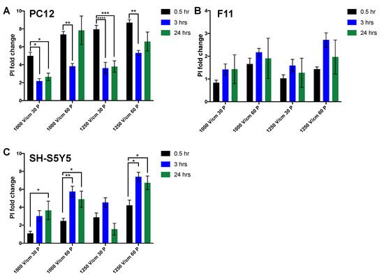For F11 cells, following electroporation, cells showed consistent and stable PI uptake at 24 h independent of treatment (Figure 5B). In contrast to the other neuronal lines, SH-S5Y5 cells showed significant increase after three and 24 h, suggesting activation of a delayed cell death pathway in these cells (Figure 5C).