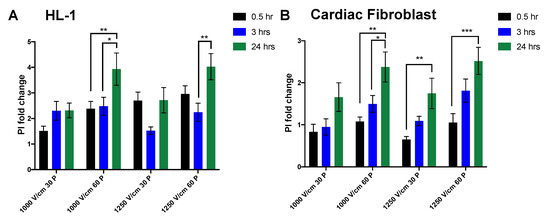 Temporal dynamics of cardiac cells in response to electroporation. The evolution of membrane permeability to PI were significantly decreased after 24 h at high voltage of 1250 V/cm in Hl-1 cardiomyocytes (A). In cardiac fibroblasts, in contrast, the PI+ fold change increased after 24 h (B). All data shown as mean ± SEM. Statistical significance performed using two-way ANOVA (* p < 0.05, ** p < 0.005, *** p < 0.001).
