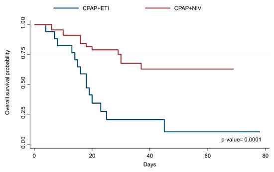 The median (IQR) duration of CPAP tended to be higher in the CPAP + ETI group (2.5 (2–7) vs. 2 (1–3) days; p-value = 0.05) with equal median (IQR) PEEP levels (10 (10–10) vs. 10 (10–10) mmHg; p-value = 0.682) (Table 2) compared with the CPAP + NIV group.