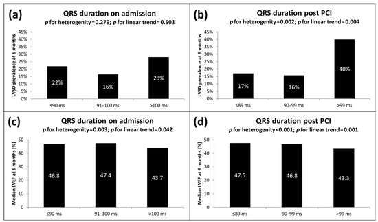 LVSD prevalence 6 months after STEMI according to terciles of QRS duration (a) on admission and (b) post PCI. Median LVEF 6 months after STEMI according to increasing terciles of QRS duration (c) on admission and (d) post PCI. LVEF, left ventricular ejection fraction; LVSD, left ventricular systolic dysfunction; ms, milliseconds; PCI, percutaneous coronary intervention; STEMI, ST-segment elevation myocardial infarction.
