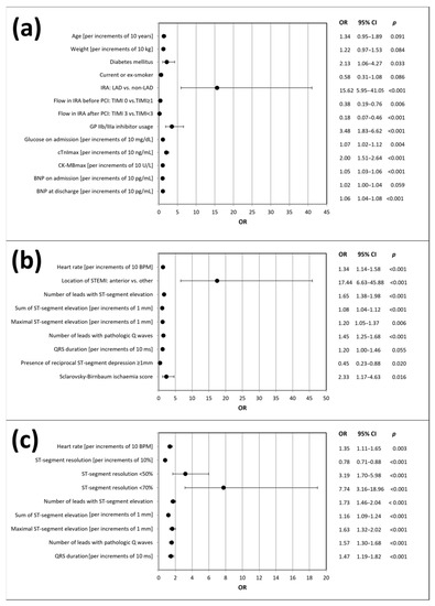 Predictors of LVSD occurrence after 6 months of follow-up according to the univariate logistic regression analysis: (a) demographic, clinical, angiographic and biochemical variables; (b) baseline electrocardiographic variables; (c) post-PCI electrocardiographic variables. BNP, B-type natriuretic peptide; CK-MBmax, maximal activity of isoenzyme MB of creatinine kinase; cTnImax, maximal concentration of troponin I; CI, confidence interval; IRA, infarct-related artery; LAD, left anterior descending artery; LVSD, left ventricular systolic dysfunction; ms, milliseconds; OR, odds ratio; PCI, percutaneous coronary intervention; STEMI, ST-segment elevation myocardial infarction; TIMI, thrombolysis in myocardial infarction score.