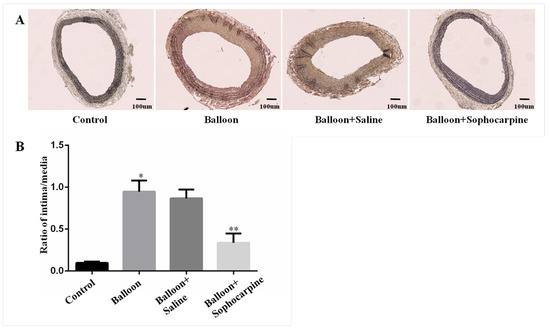 Introduction: Balloon angioplasty is a commonly applied procedure for treating atherosclerotic vascular diseases. However, the maintenance of long-term lumen patency is relatively difficult due to the occurrence of restenosis. Previous research has shown that the occurrence of vascular wall inflammation is associated with higher rates of restenosis. Sophocarpine (SPC) can exert various therapeutic effects such as anti-oxidation, anti-inflammation, anti-tumor, antivirus and immune regulation. This study aimed to investigate whether SPC can alleviate intimal hyperplasia following balloon injury in a rat carotid artery model. Methods: Twenty Sprague–Dawley rats were randomly assigned to four groups: (i) control, (ii) balloon injury, (iii) balloon injury followed by saline injection, and (iv) balloon injury followed by SPC administration. Each group contained five rats. A high-pressure balloon of 3 mm × 20 mm was placed in the carotid artery. The balloon was inflated to a pressure of 8 atmospheres to carry out rat carotid artery balloon injury model. The areas of neointimal and media were determined by Verhoeff_Van Gieson staining, and the intima-to-media (I:M) ratios were subsequently evaluated. After that, the protein levels of IL-6, IL-1β, MCP-1, NF-κB, TNF-α, VCAM-1, ICAM-1 and eNOS were measured. Results: The ratio of I:M was remarkably higher in the balloon injury group than in the control group (p < 0.01). SPC could significantly decrease the ratio of I:M compared with the balloon injury group (p < 0.01). Besides, the protein levels of IL-6, IL-1β, MCP-1, NF-κB, TNF-α, ICAM-1 and VCAM-1 were increased in rat carotid arteries exposed to balloon injury (p < 0.01), and treatment with SPC could attenuate these effects (p < 0.05). Furthermore, balloon injury inhibited the protein expression of eNOS (p < 0.01), and SPC could elevate its level (p < 0.05). Conclusions: SPC could alleviate an intimal hyperplasia in balloon-injured carotid artery, and the mechanisms underlying this protective effect might be due to its inhibitory potency against inflammation signals. Our study also implies the potential applicability of SPC in treating restenosis after balloon angioplasty.