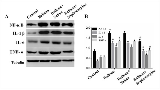 Expression of NF-κB, IL-1β, IL-6 and TNF-α in various groups. (A) Western blot analysis showed that balloon injury significantly induced the expression of NF-κB, IL-1β, IL-6 and TNF-α, while sophocarpine decreased the expression. (B) Quantification of the Western blot results. * p < 0.01 versus the control group, # p < 0.05 versus the balloon group.