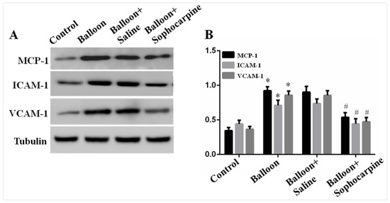Expression of MCP-1, VCAM-1 and ICAM-1 in various groups. (A) Western blot analysis showed that balloon injury significantly induced the expression of MCP-1, VCAM-1 and ICAM-1, while sophocarpine depressed the expression. (B) Quantification of the Western blot results. * p < 0.01 versus the control group, # p < 0.05 versus the balloon group.
