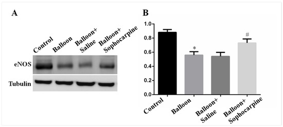 Expression of eNOS in various groups. (A) Western blot analysis showed that balloon injury significantly decreased the expression of eNOS, while sophocarpine induced the expression. (B) Quantification of the Western blot results. * p < 0.01 versus the control group, # p < 0.05 versus the balloon group.