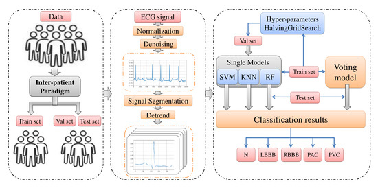 In view of the foregoing, we aim in this paper to design and investigate an automatic classification system using a new comprehensive ECG database inter-patient paradigm separation to improve the minority arrhythmical classes detection without performing any feature extraction. We investigated four supervised machine learning models: support vector machine (SVM), k-nearest neighbors (KNN), Random Forest (RF), and the ensemble of these three methods. We test the performance of these techniques in classifying: Normal beat (NOR), Left Bundle Branch Block Beat (LBBB), Right Bundle Branch Block Beat (RBBB), Premature Atrial Contraction (PAC), and Premature Ventricular Contraction (PVC), using inter-patient real ECG records from MIT-DB after segmentation and normalization of the data, and measuring four metrics: accuracy, precision, recall, and f1-score. Figure 2 illustrates a summary of the overall procedures used in this paper.