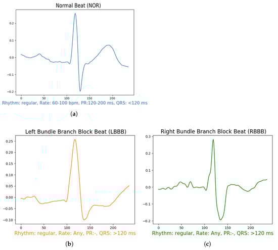 After filtering the signal, we performed a sampling of 0.66 s segment for each beat, which means 236 samples in each segment Figure 4, using the annotation data available in the data set for R-peak positions of each beat. The segment’s section is divided into two intervals of t = 0.33 s before and after the annotation position in the signal. From all the data, we used only 5 specific known annotations, from all the labels which are: Normal Beat (NOR), Left Bundle Branch Block Beat (LBBB), Right Bundle Branch Block Beat (RBBB), Premature Atrial Contraction (PAC), and Premature Ventricular Contraction (PVC) as shown in Figure 4. To maintain the fluctuations in the data and yield a better insight of the signal features, we removed a linear trend from the resulting data by calculating the least-squares regression line to estimate the growth rate r. Then subtract the differences (i.e., the deviations from the least-squares fit line) from the data. This method enables the model to focus more on the class features during the training. The final results are demonstrated in Figure 4.
