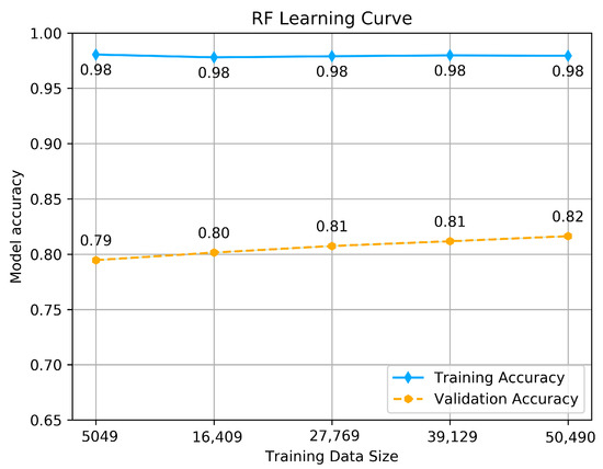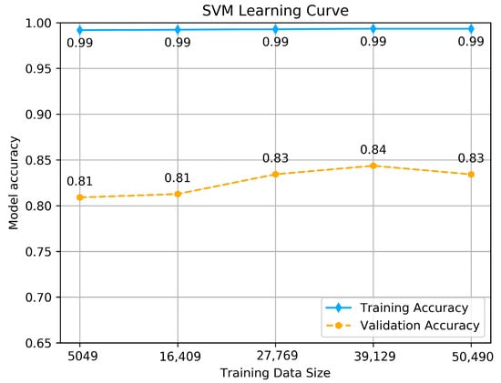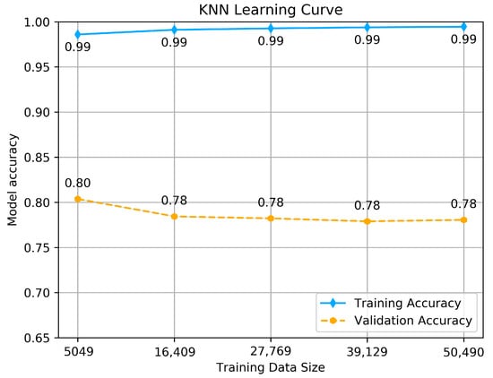To estimate how the models are expected to perform during training and when used to make predictions on unseen data, to see if the model is well-fitted, we performed a learning curve graph. The learning curve reflects the model’s learning process, which is illustrated by measuring the accuracy of each size of training and validation set that starts from a small data size to the maximum. The accuracy should maximize as more data is fitted, and if it reaches 1 (100% of accuracy), it means the training data set is perfectly learned. The learning curve calculated using a training set shows how the model is learning, and the learning curve calculated from the hold-out validation set provides an idea of if the model is generalizing on unseen data. We tested each model with its hyper-parameters selected above by making a dual learning curve of the training set and a validation set, and measuring the accuracy of each one. The results are shown in Figure 5, Figure 6 and Figure 7.