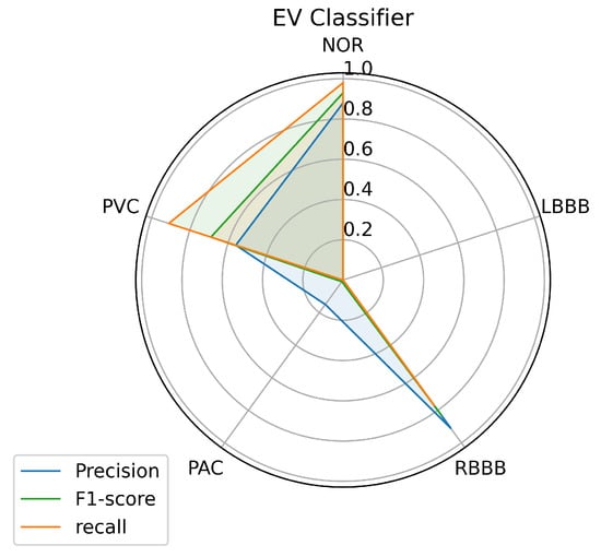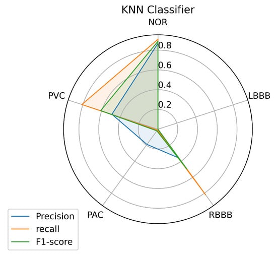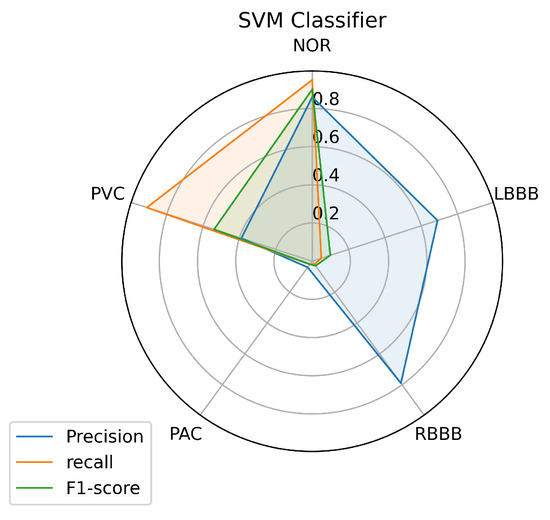 Figure 8 illustrates the results achieved using the SVM classifier. From the results, it is obvious that the SVM model succeeded in predicting all the classes with different performances. The most predictable classes for SVM are NOR and RBBB, achieving the highest measurement in terms of all metrics which go above 0.75, followed by the PVC. But for LBBB and PAC, it seems to be difficult to predict, as the model didn’t achieve good results that went under 0.50 in terms of all metrics, except for LBBB, which achieved good precision of 0.70. However, it is not surprising for PAC to be less predictable as it has insufficient data in Table 1 for the model to train on because most PACs used in the test set belong to one patient and the rest are from different patients.