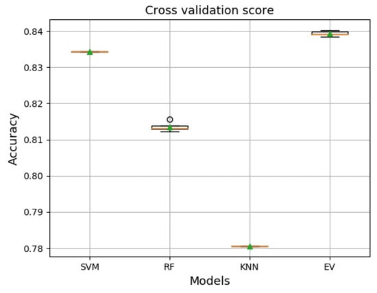 Figure 11 shows the performance results measured by the cross-validation score technique of each model trained with the training set and validated with the validation set. The results revealed that the ensemble voting achieved the best performance and even better than the other models in terms of average accuracy, as it exceeded an accuracy of 0.83 with a maximum accuracy of 0.84. However, the results are not surprising because the mainly used set of models perform well as a single model, and thus, combining these models with the voting technique would give better performance than the best single model. Concerning the results specified in Figure 11, the ensemble voting method appears to be appropriate and promising to improve the prediction results. Hence, we tested it directly on the unseen data set, the test set.