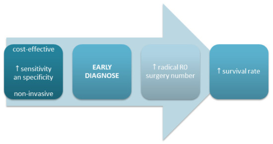 Most other investigated biomarkers are expensive or at an early stage of evaluation and therefore cannot be used in everyday clinical practice. An ideal biomarker for PDAC should exhibit high sensitivity and specificity, be non-invasive, and be cost-effective to improve early diagnosis and subsequent treatment (Figure 1).