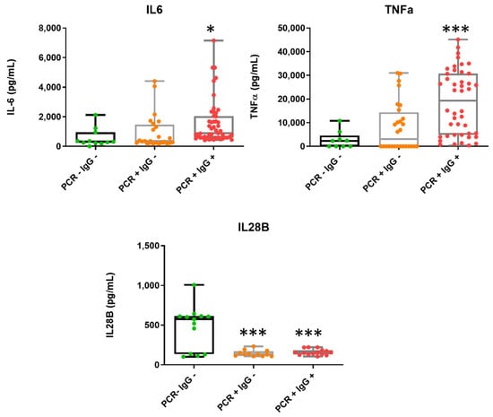 Determination of cytokine concentrations in patient samples. Box-and -whisker plots of IL-6, TNF-α and IL-28B levels in the serum of patients. PCR− IgG−, patients with a discharge diagnosis of COVID-19 (green); PCR+ IgG−, patients with early SARS-CoV-2 infection (orange); PCR+ IgG+ patients with active SARS-CoV-2 infection (red). Data represent the mean ± S.D. * p ≤ 0.05; *** p ≤ 0.001.