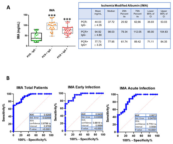 Levels of ischemia-modified albumin (IMA) in the sera of COVID-19 patients. (A) Box-and -whisker plots of IMA concentrations in patient samples. PCR− IgG−, patients with a discharge diagnosis of COVID-19 (green); PCR+ IgG−, patients with early SARS-CoV-2 infection (orange); PCR+ IgG+, patients with active SARS-CoV-2 infection (red). Data in the graph represent the mean ± S.D. *** p ≤ 0.001. The right table shows the mean ± standard error, the median, 25th percentile, 75th percentile, lower 95% of CI and upper 95% of CI of IMA values. (B) Receiver operating characteristic (ROC) curves and area under the curve (AUC) for ischemia-modified albumin in SARS-CoV-2-infected patients (total, early infection and acute infection).