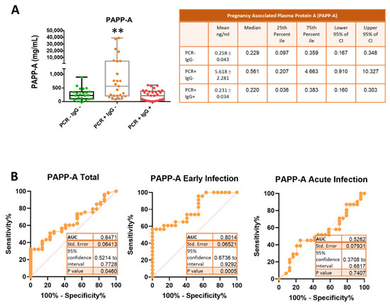 Levels of pregnancy-associated plasma protein-A (PAPP-A) in the sera of COVID-19 patients. (A) Boxand -whisker plots of PAPP-A concentrations in patient samples. PCR− IgG−, patients with a discharge diagnosis of COVID-19 (green); PCR+ IgG−, patients with early SARS-CoV-2 infection (orange); PCR+ IgG+, patients with active SARS-CoV-2 infection (red). Data in the graph represent the mean ± S.D. ** p ≤ 0.01. The right table shows the mean ± standard error, the median, 25th percentile, 75th percentile, lower 95% of CI and upper 95% of CI of PAPP-A values. (B) Receiver operating characteristic (ROC) curves and area under the curve (AUC) for pregnancy-associated plasma protein-A in SARS-CoV-2-infected patients (total, early infection and acute infection).