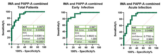 Receiver operating characteristic (ROC) of the IMA and PAPP-A combination. ROC curves and area under the curve (AUC) comparing the potential of the combination of ischemia-modified albumin (IMA) and pregnancy-associated plasma protein-A (PAPP-A) to diagnose COVID-19 (total, early infection and acute infection).
