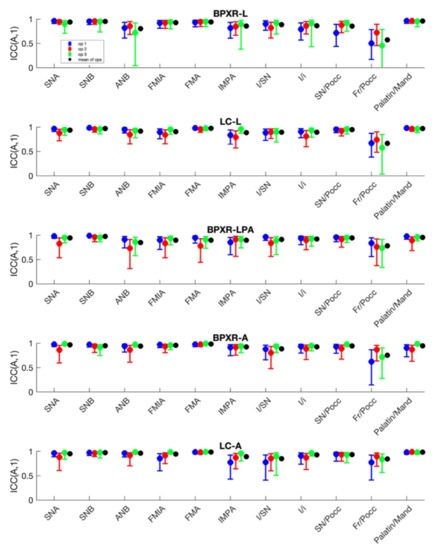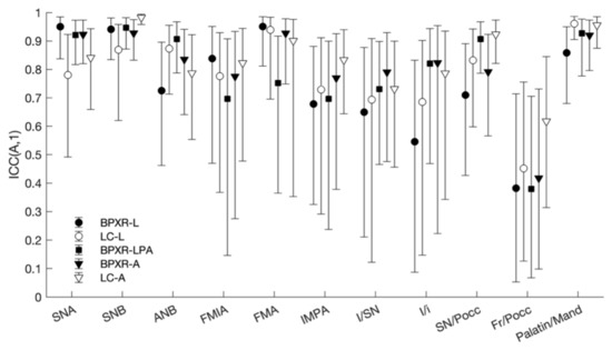 The concordance with the reference method was the best with the BPXR-A method, as presented in Figure 5 and Table 3. With the BPXR-A method, the mean ICC of the angles was 0.86, while it was 0.84 for the BPXR-LPA method and 0.82 for the BPXR-L method. The concordance with the reference method was good or excellent for most angles, except Fr/SN (mean ICC = 0.72).