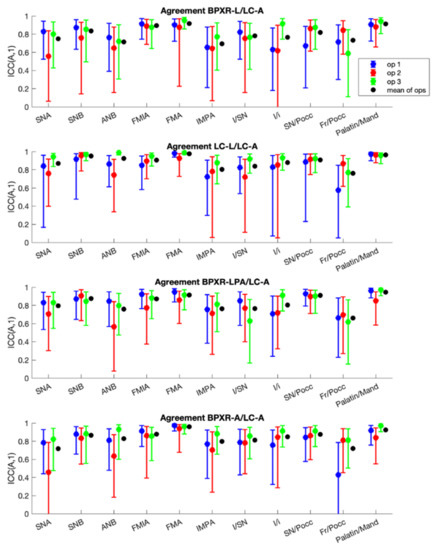 The interoperator reliability was investigated (1) for the landmarks (for the three methods using landmarks, i.e., LC-L, BPXR-L, and BPXR-LPA) and (2) for the angles (for the five methods). This reliability was also evaluated using ICC(A,1). Here, the variance ratio quantified the absolute agreement between a single measurement of the three operators for each of the 13 patients. For each patient, a single measurement of each operator was randomly chosen from among the two or three they made. The means of ICCs for the angles or methods were taken using the Fisher transform.