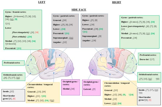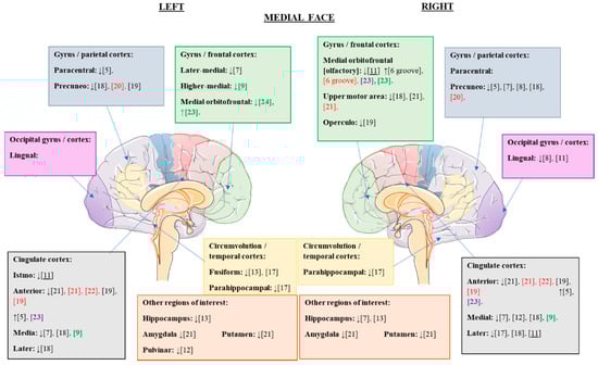 Once the alterations of the cerebral cortex were analyzed at the global level, we proceeded to study the changes observed in the different articles at the regional cortical level. The cortical alterations found in the different studies are summarized in Figure 2 and Figure 3.