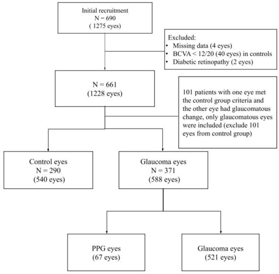 Flow chart of eligible eyes selection. After manual evaluation of the raw data to exclude ineligible eyes, we grouped the eyes into control eyes (540 eyes), PPG eyes (67 eyes), and glaucoma eyes (521 eyes) for the analysis. BCVA, best corrected visual acuity; PPG, pre-perimetric glaucoma.