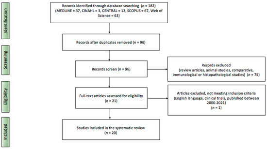The initial search revealed 182 results. After applying criteria of exclusion and inclusion, the database search revealed 20 records (MEDLINE n = 20, Cinahl n = 0, Central n = 0, Scopus n = 0, Web of Science n = 0) published in 2005–2021 submitted for the further analysis (Figure 1).