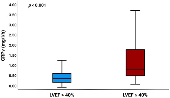 The values for the median admission CRP, 24 h, and peak CRP were as follows: 2.1 (IQR 1.0–4.2), 12.4 (IQR 6.9–20.1), and 22.5 (IQR 11.7–45.5) mg/L, respectively. The median CRPv was 0.42 (IQR 0.21–0.76) mg/L/h and was significantly higher in patients with LVEF ≤ 40% (p < 0.001) (Figure 1).