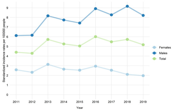 | Age Group (Years) | Average Incidence | Year | p-Value a | p-Value b | ||||||||