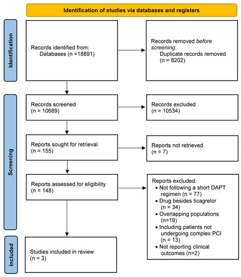 The search strategy and selection process are summarized in Figure 1. Our initial search yielded 10,689 potential studies. After exclusions, three studies, including 8385 participants (4176 on ticagrelor monotherapy after a short course of ticagrelor-based DAPT; 4209 on standard DAPT), were included for analysis [11,12,13]. The main features of the included studies, baseline clinical characteristics, and the risk of bias in each study are shown in Table S1 and Figure S1. The mean age of included patients was 64.5 years, 78.4% were males, 34.6% of them suffered from diabetes, and 19.9% from chronic kidney disease. Ticagrelor-based DAPT duration was 1 month in one study [11] and 3 months in the remaining studies [12,13]. Ticagrelor monotherapy after the short course of DAPT was administered for 23 months in one study [11], 9 months in one study [13], and 12 months in one study [12]. The standard regimen was ticagrelor plus aspirin for 12 months in one study [13] and for 15 months in one study [12], while a regimen based on 12-month DAPT (aspirin and either ticagrelor for ACS or clopidogrel for stable CAD) followed by 12-month aspirin monotherapy was adopted in one study [11]. One study excluded patients presenting with ST-segment elevation myocardial infarction [12].