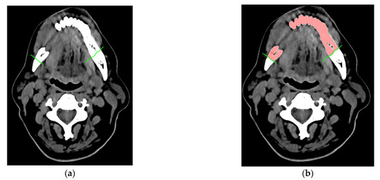 In the case of specifying the area to be resected, the procedure additionally includes the determination of virtual segmentation curves, defined on the DICOM data (Figure 3a). They additionally enable the separation of the resected mandibular bone from the dental crowns. Thus, it is possible to estimate the volume of the resected area more accurately. This is important when the process of collecting free tissue grafts containing a bone element to restore the continuity of the mandible is expected. After introducing the initial parameters and optionally the virtual curves, the last step of the segmentation process involves the application of the region growing method. It belongs to the area method group. As a result of the application of the region growing method [65], it is possible to classify all pixels with a similar shade of grey to the triangulation process and assign them to one group that defines the entire mandible structure or the resected area (Figure 3b).