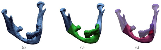 3D visualization of the geometry of the mandible: (a) Without the application of the procedure; (b) with application of the procedure together with determining resection area; (c) with application of the procedure in terms of estimating the volume of the resection area.