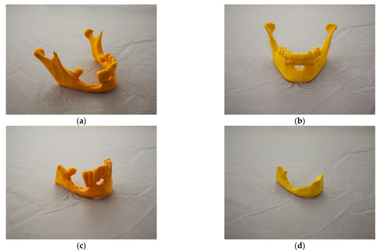 In order to make physical models, the 3D printing technique fused filament fabrication (FFF) was used. This method is equivalent to the fused deposition method (FDM) method. The creation process consists in melting the filament in a heated head, and then it is applied to the worktable. Once the first layer is placed, more layers are added to the object until the entire model is printed [71,72]. In the process of making physical models, an anatomical model of the mandible with marked resection sites (Figure 6a), a model representing mirror of the health part of the mandible onto the pathological part (Figure 6b), a resected area (Figure 6c), and a model serving for estimating the volume of the resected bone tissue (Figure 6d) were printed.