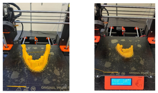 All models were made on a Prusa MK3s printer. PLA poly (lactide) material was used for printing. It is one of the main biodegradable polymers used, among others, in medicine (dental implants) [73]. This material is characterized by adequate tensile strength and stiffness. In order to increase the accuracy of the models’ printing, the smallest layer thickness (0.15 mm) was used, which could be applied by the selected system. Additionally, each model was oriented during printing so that the lateral surface of the mandible to which titanium plates are most often fitted was made along the Z axis. This procedure increased the accuracy of the surface in this area of the mandible (Figure 7).