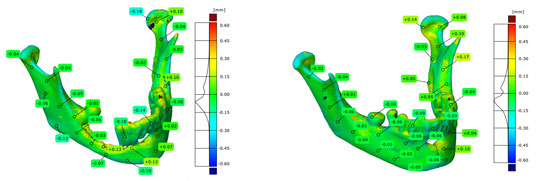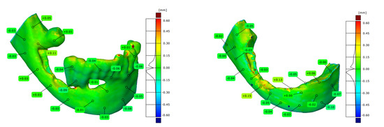 In the case of the analysed accuracy of models, the deviation of shape fell within the tolerance range of +/− 0.15 mm. Taking into account the current recommendations, the required accuracy of the printout for models used in the treatment planning process should be in the range of +/− 0.25 mm [78,79]. Thanks to the use of two control processes in the procedure (which allow for assessment of the accuracy of the models and the surgical process), it is possible to continuously improve the process in terms of the controlled preparation of templates and surgical tools in terms of the accuracy expected during the procedures. It is important that the procedure for controlling the accuracy of a surgical procedure gives valuable information when determining the correct rehabilitation process.