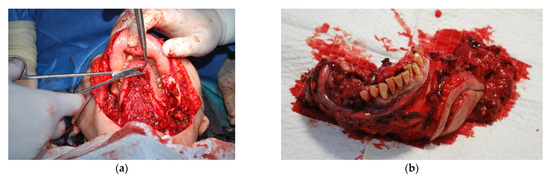 The patient P.W., 59 years of age, was referred due to a painful ulceration of the lower gingiva and the floor of the mouth on the right side, partially spreading to the left side, and enlarged lymph nodes on both sides of the neck and a neoplastic infiltration of the submandibular skin on the left side. After performing imaging diagnostics (CT and MRI) and taking a section from the ulcer, the patient was diagnosed with squamous cell carcinoma covering the floor of the mouth on the right side, partially on the left side of the infiltrating body and branches of the mandible with bilateral metastases to the lymph nodes in the neck and a neoplastic infiltration of the submandibular skin on the left side (T4aN3bMo). The patient was qualified for surgery, for which she gave her informed consent and the use of data in scientific publications. The operation consisted in removing the tumour of the lower gingiva and the floor of the oral cavity with partial resection of the mandibular branch and body on the right side and the mandibular body on the left side, bilateral removal of neck lymph nodes groups I–V with non-lymphatic structures: internal jugular vein, accessory nerve, and the sternocleidomastoid muscle. The tumour-infiltrated skin of the left submandibular area was also removed in the tissue complex. Reconstruction of the post-reaction cavity tissue defect and restoration of the continuity of the mandible was planned using a vascularized free bone-tissue flap taken from the left fibula. Adjuvant radio-chemotherapy is scheduled after the surgery. Moreover, on the basis of computed tomography, models for the planned surgical procedure were printed based on the proposed procedure (Figure 6). The model with marked bone resection sites (Figure 6a) allowed for precise determination of the places of the mandibular intersection during surgery (Figure 11a). The surgical procedure was uneventful according to the oncological protocol. The resected part (Figure 11b) of the mandible was then compared with the model planned before the procedure (Figure 6c).