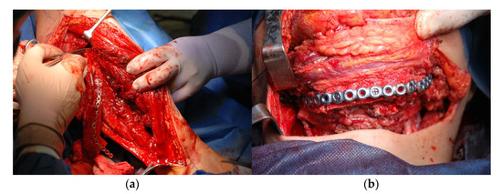 Reconstructing the continuity of the body and branches: (a) sampling bone tissue from the fibula; (b) anastomosis of the sampled bone parts with the titanium splint.
