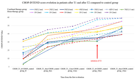 - Higher improvements in CHOP-INTEND scores 6 months after T1 compared to the same period after T2. Calculated medians for CHOP-INTEND: before T1—15 points, 6 months later it increased to 35 points; before T2—40 points, 6 months later it increased to 52 points.