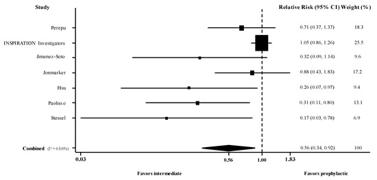 There were 2 randomized [11,30] and 5 observational studies [27,28,29,34,35] (n = 2009, weighted age 61 years, males 61%, ICU 53%) that reported the RR for death in patients with COVID-19 administered intermediate versus prophylactic dose of thromboprophylaxis. Meta-analysis of these 7 studies (use of adjusted estimates for the non-randomized) revealed a pooled adjusted RR for death of 0.56 (95% confidence intervals [CI] 0.34, 0.92; I2 66%) (Figure 1). Meta-analysis of the 5 observational studies [27,28,29,34,35] showed pooled unadjusted RR at 0.45 (95% CI 0.29, 0.69; I2 28%), whereas the adjusted pooled RR remained the same at 0.45 (95% CI 0.28, 0.72; I2 36%).