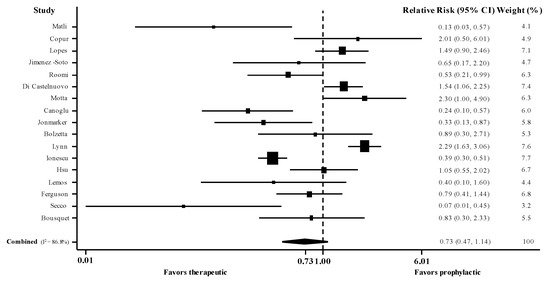 There were 2 randomized [12,33] and 15 observational studies [23,24,25,26,29,31,32,34,35,36,37,38,39,40,41] (n = 7776, weighted age 64 years, males 54%, ICU 21%) that reported the RR for death in patients with COVID-19 administered therapeutic versus prophylactic dose of thromboprophylaxis. Meta-analysis of these 17 studies (use of adjusted estimates for non-randomized) revealed a pooled adjusted RR for death at 0.73 (95% CI 0.47, 1.14; I2 87%) (Figure 2). Meta-analysis of the 15 observational studies showed pooled unadjusted RR for death at 1.24 (95% CI 0.88, 1.74; I2 87%), whereas the adjusted pooled RR was 0.71 (95% CI 0.44, 1.15; I2 88%).